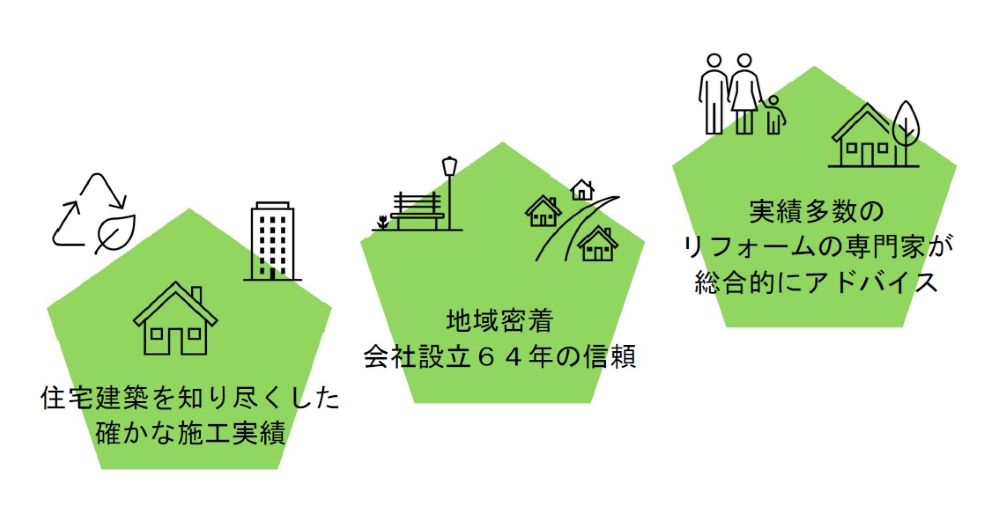 住宅建築・公共建築で培った技術やノウハウを惜しみなくリフォーム・リノベーションでご提供いたします。小さな部品交換から水回りリフォーム、リノベーション、間取り変更まで信頼と実績でお客様の期待に応えます。